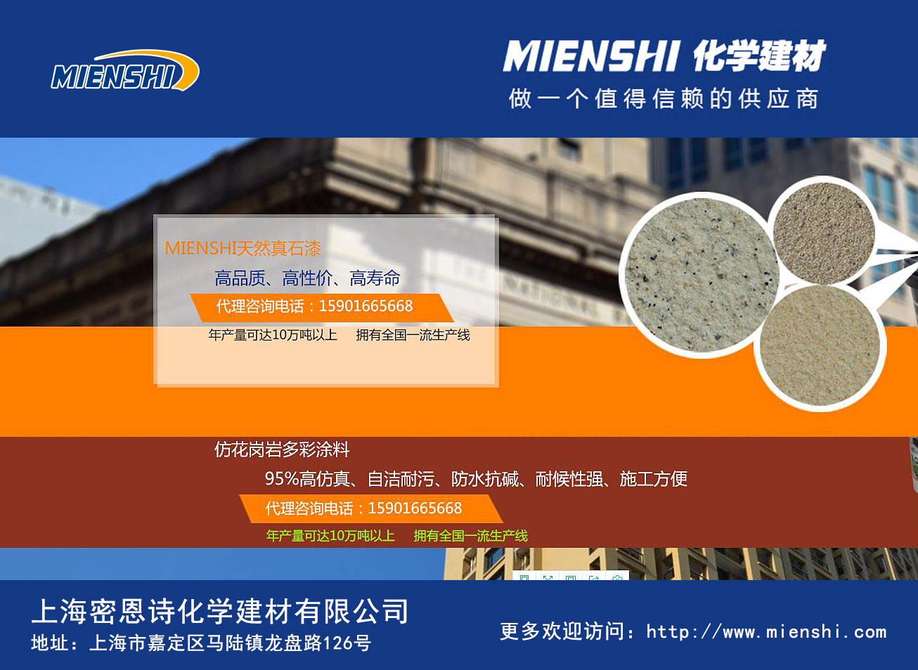 上海密恩詩化學建材有限公司是一家以外墻保溫、涂料產品為核心,以科學、誠信、成長為信念的高新技術企業(yè)。公司位于地理位置優(yōu)越、交通便利的上海市嘉定工業(yè)區(qū)。