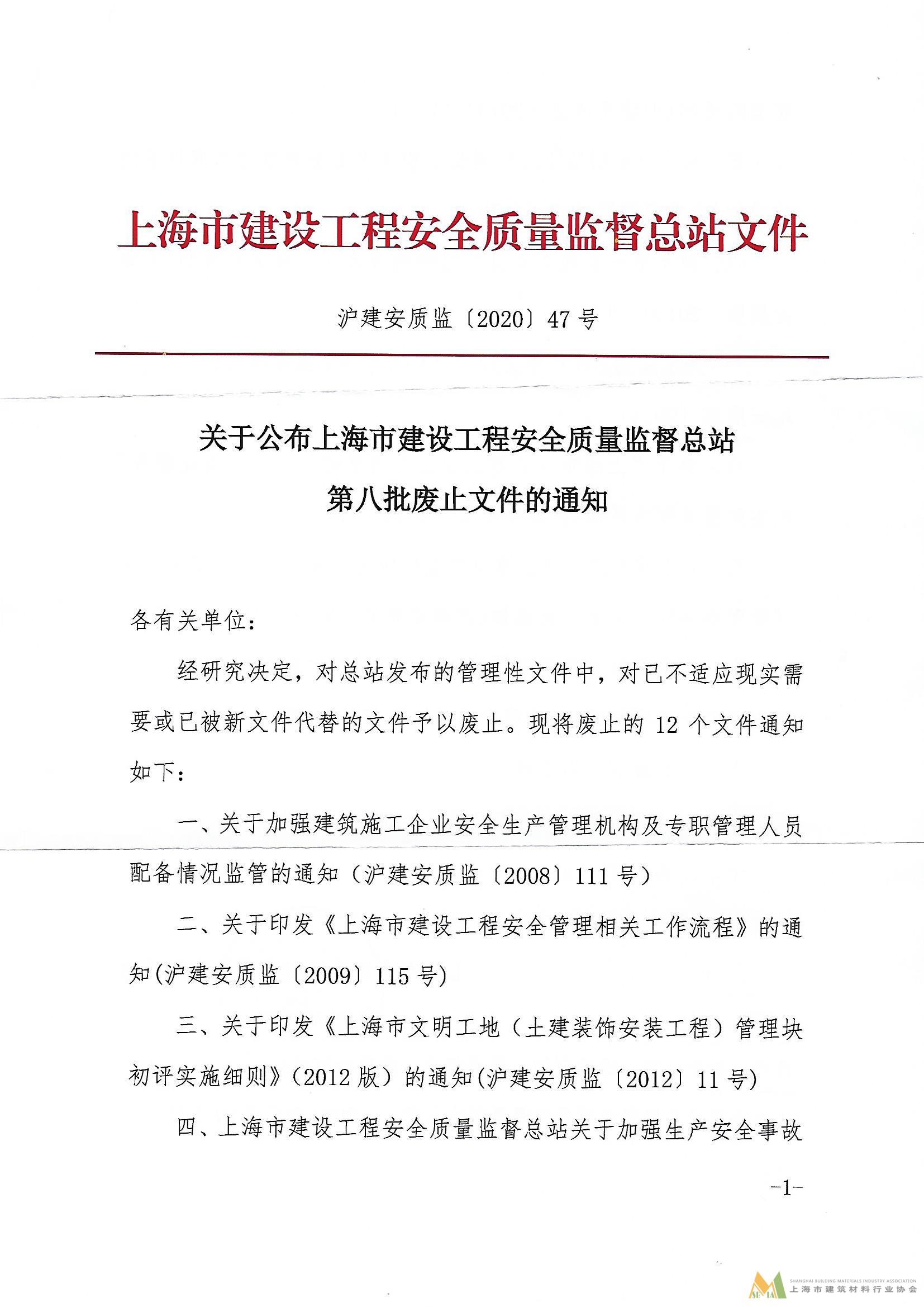 關(guān)于公布上海市建設(shè)工程安全質(zhì)量監(jiān)督總站第八批廢止文件的通知